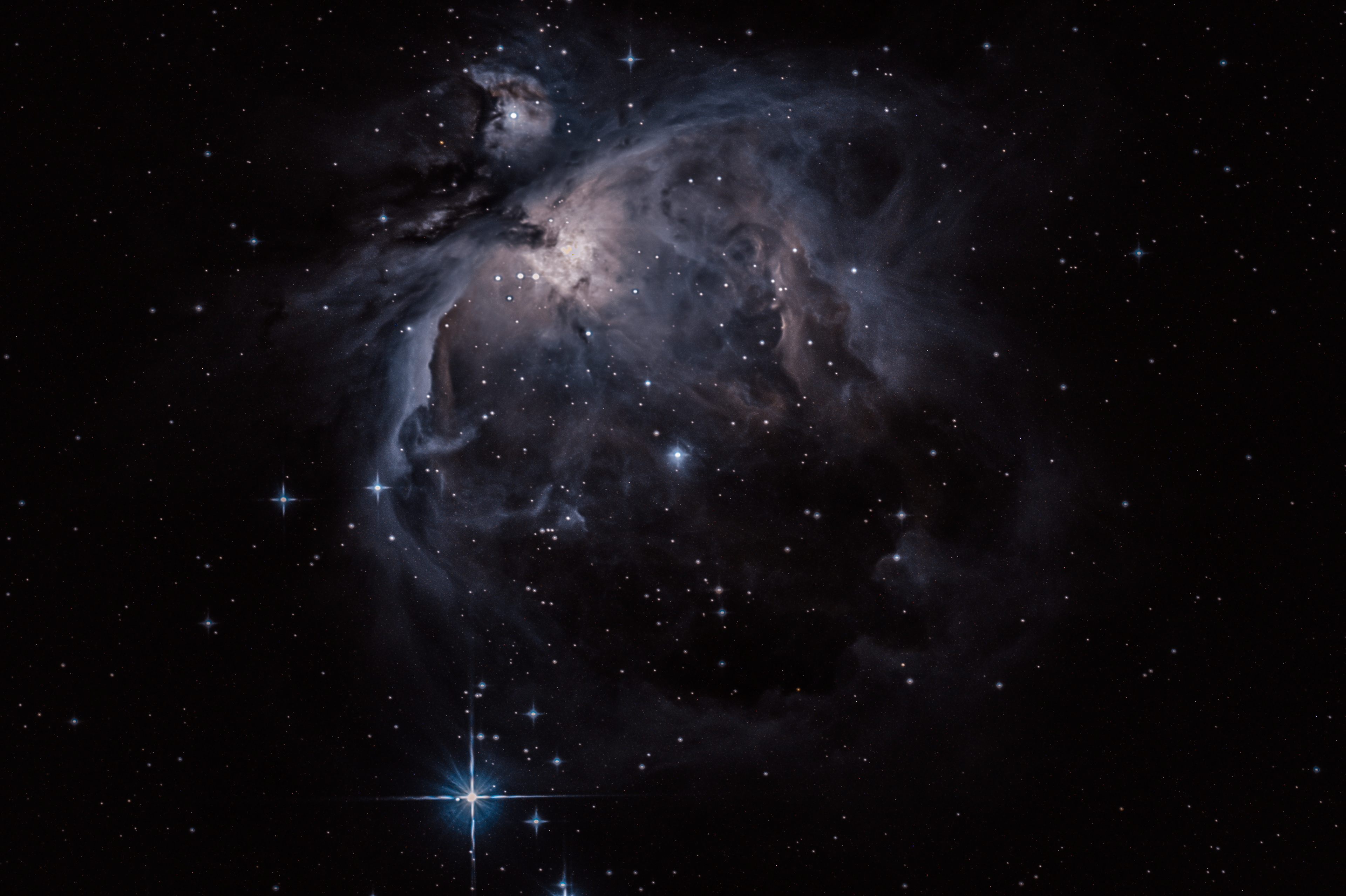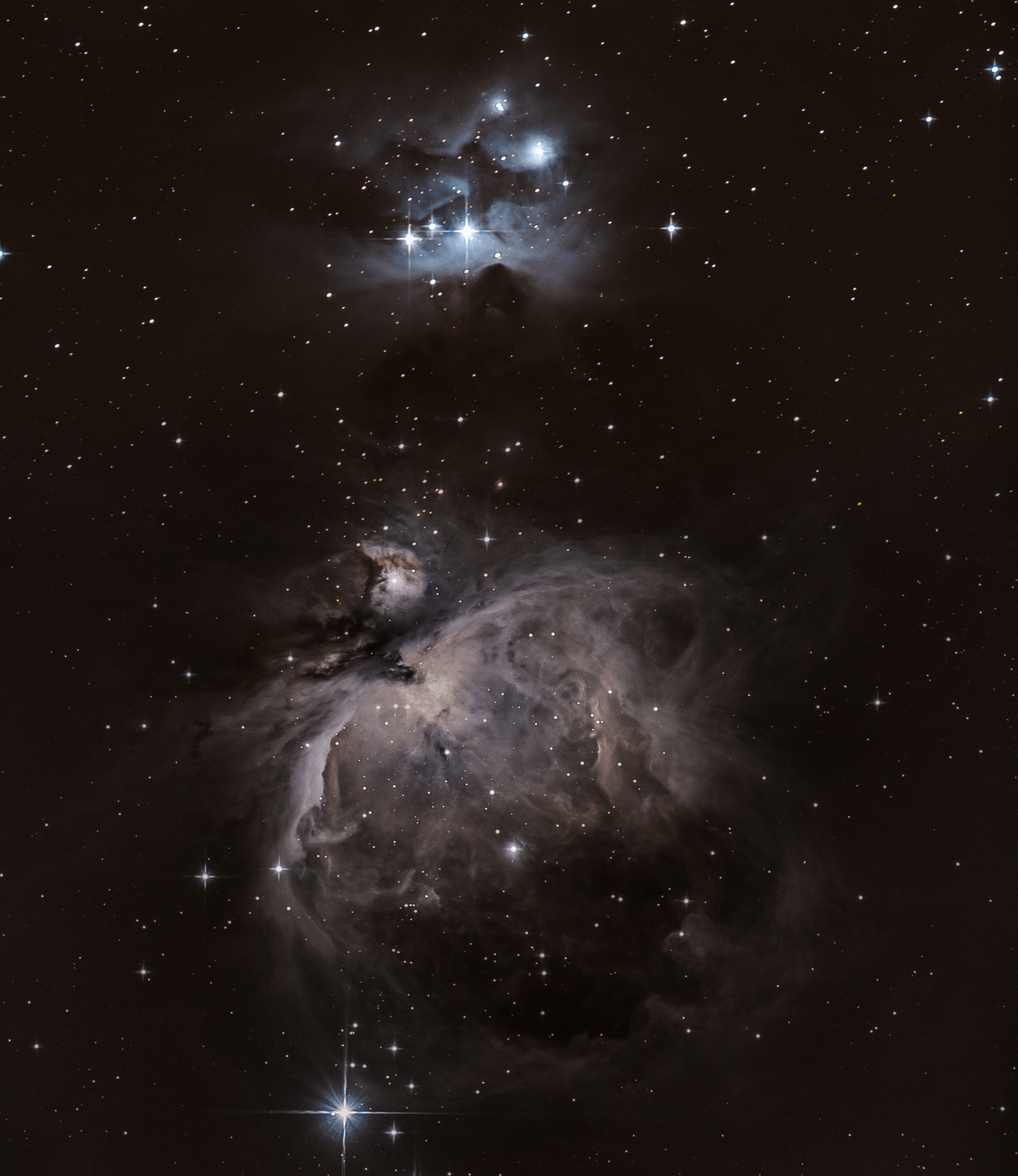 The Great Nebula in Orion (Messier 42), de Mairan's Nebula (Messier 43), and the Running Man Nebula. From Pagosa Springs, CO.