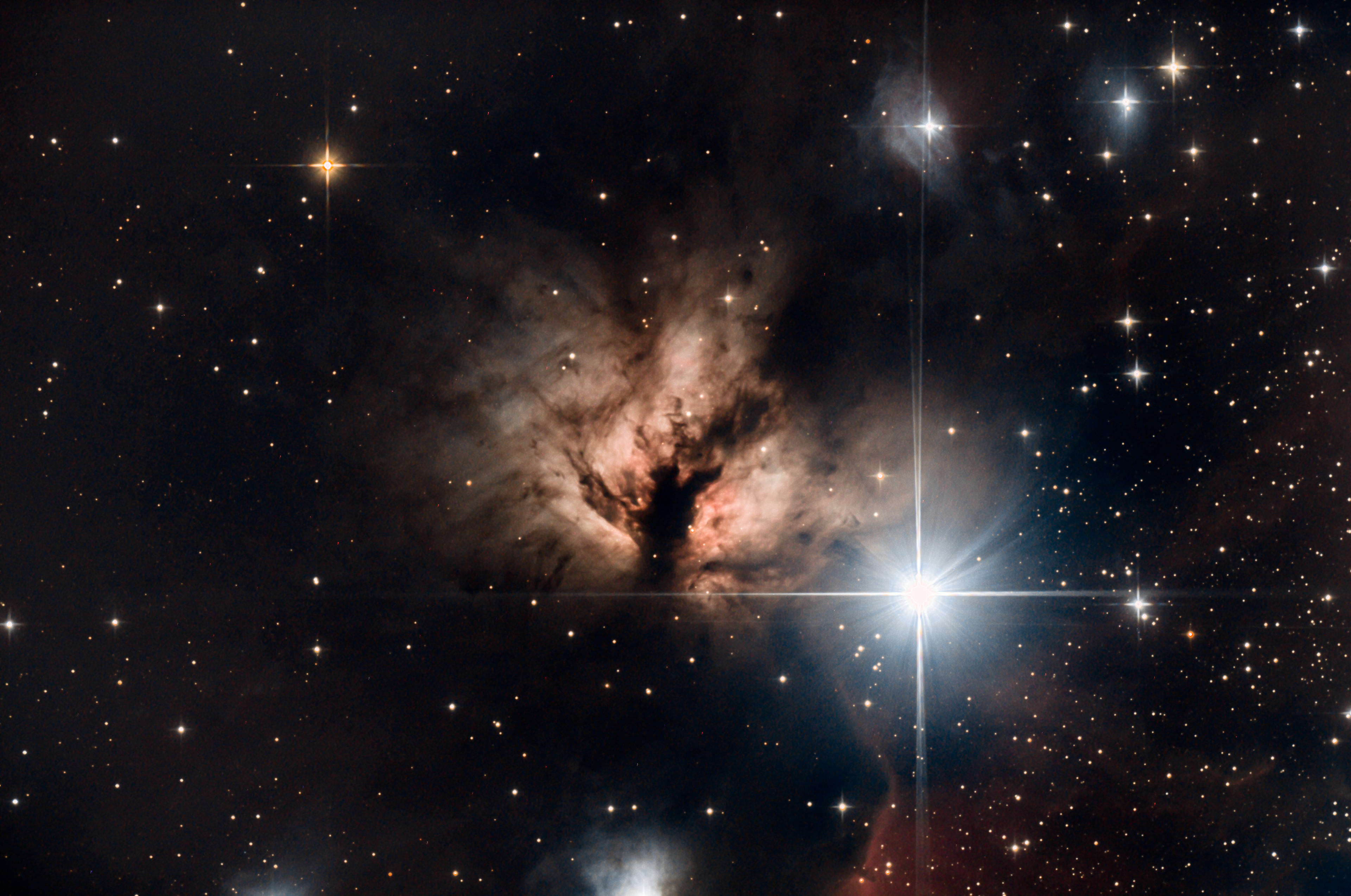 The Flame Nebula. East of the Horsehead Nebula. The bright star is Alnitak. From Pagosa Springs, CO.